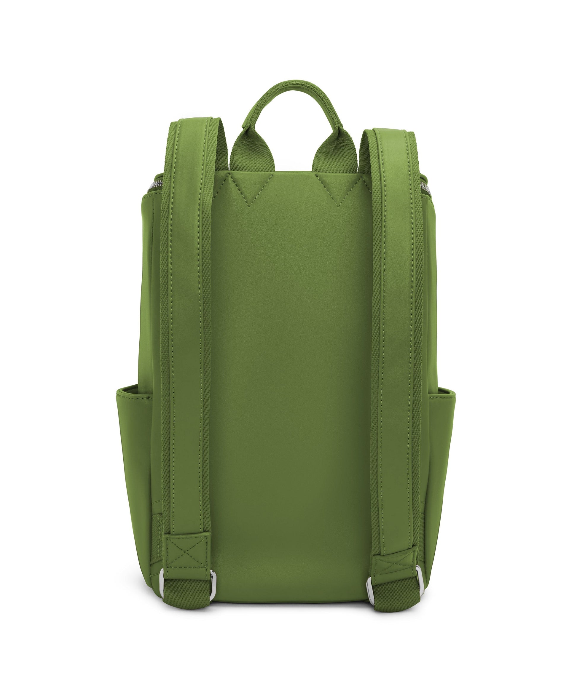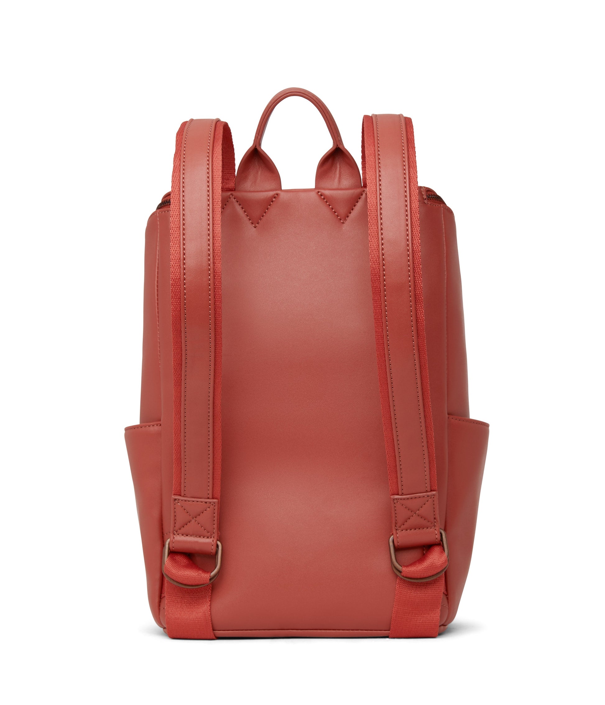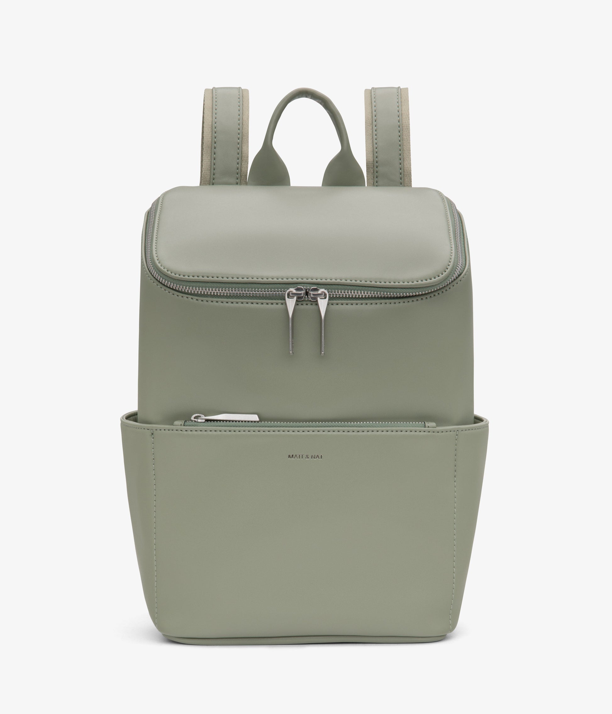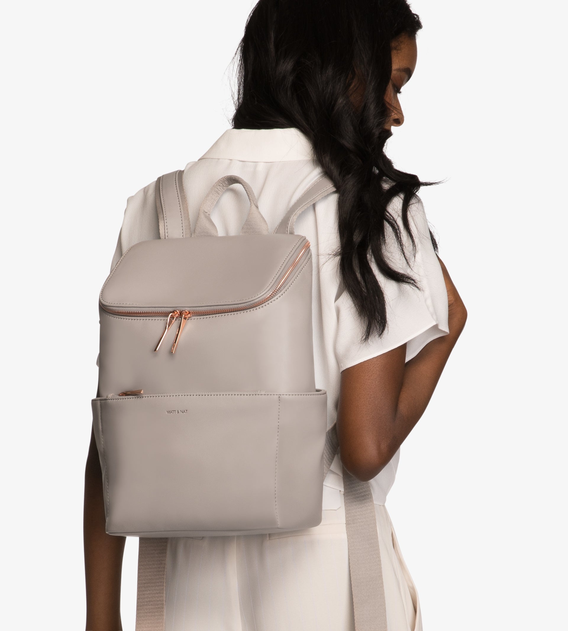 Backpack with top zipper closure. Adjustable webbing straps. Side pockets and front zipper pocket. Fits a 13” laptop. Also available in Purity Collection.